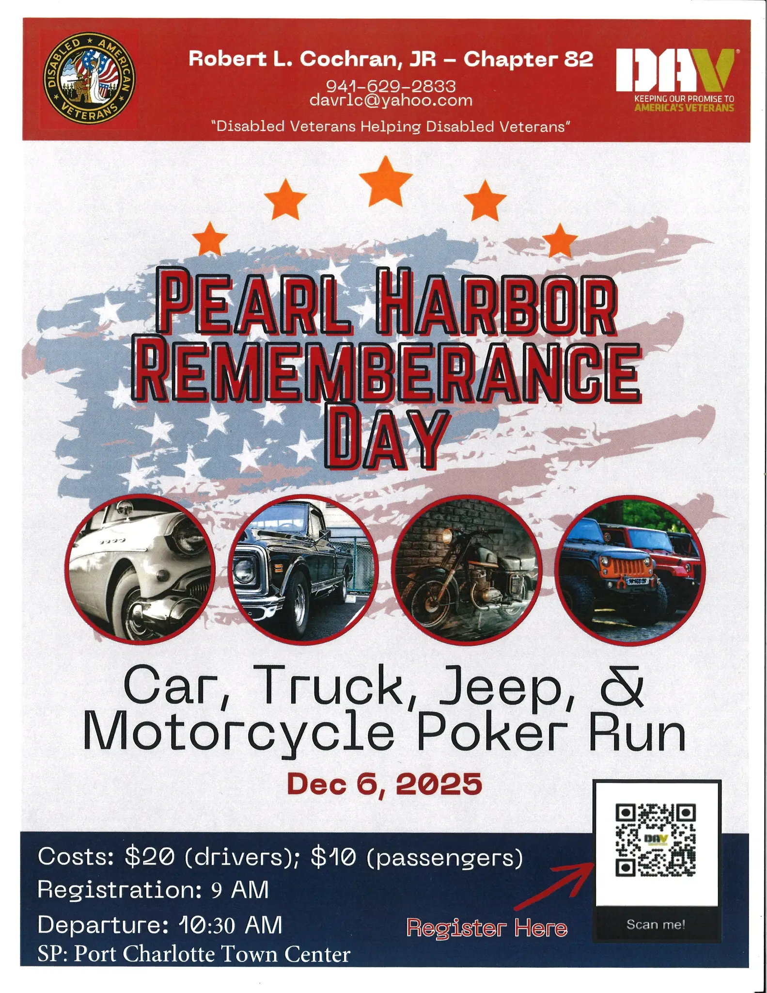 DAV - Pearl Harbor Remembrance Day Poker Run December 6th: 10:30 am - 5:00 pmDAV - Office of Disabled American VeteransCar, Truck, Jeep & Motorcycle Poker RunProceeds benefit DAV's Chapter 82